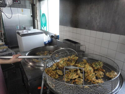 かき揚げをフライヤー(揚げ物機)に投入していきます。